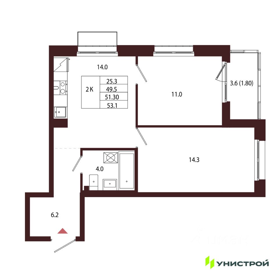 Общая площадь51,3 м²