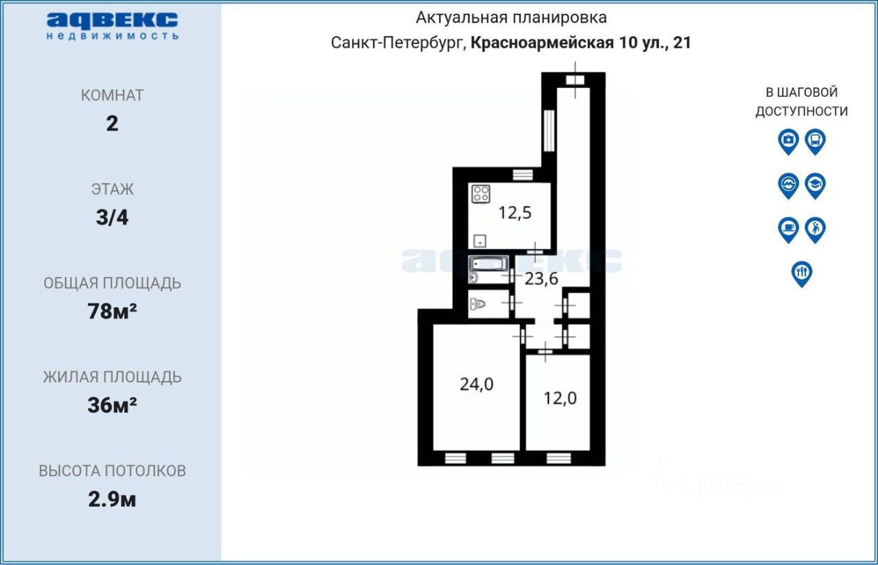 Площадь кухни 12,5 кв.м, комнат 24 и 12 кв.м, санузел раздельный, имеется 2 встроенных шкафа. Высота потолка 2,9.