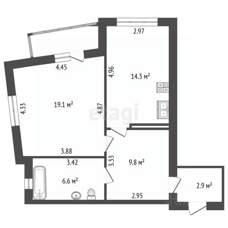 Общая площадь квартиры — 52,7 м²: кухня-гостиная 14,3 м², светлая жилая комната с двумя окнами и балконом — 19,1 м², санузел с окном — 6,6 м², просторный холл — 9,8 м² и застекленный балкон. Квартира полностью подготовлена для немедленного заселения!