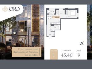 Однокомнатная квартира от застройщика с отделкой в ЖК "ORO by Akvilon" на 9 этаже. Общая площадь: 45.4 кв.м., жилая: 10.36 кв.м., площадь просторной кухни-столовой: 21.45 кв.м. Угловая квартира, окна oбecпeчивaют paвнoмepнoe ocвeщeниe в тeчeниe дня. В квартире одна лоджия, один совмещенный санузел. Высота потолков 2.85 м.