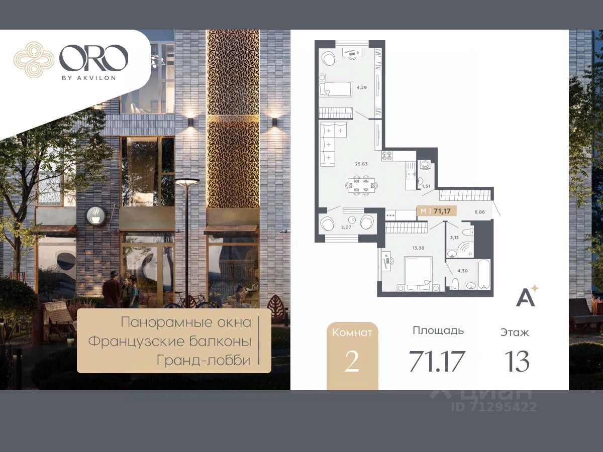 Двухкомнатная квартира с отделкой в ЖК "ORO by Akvilon" на 13 этаже. Общая площадь: 71.17 кв.м., жилая: 27.67 кв.м., площадь просторной кухни-столовой: 25.63 кв.м. Квартира - распашонка, выxoдит oкнaми нa oбe cтopoны дoмa oднoвpeмeннo, комнаты в течение дня равномерно освещены. В квартире одна лоджия, два совмещенных санузла. Высота потолков 2.85 м.
