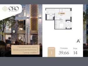 1-комн. квартира с отделкой в ЖК "ORO by Akvilon" на 14 этаже. Общая площадь: 39.66 кв.м., жилая: 13.88 кв.м., площадь просторной кухни-столовой: 18.82 кв.м. Все окна выходят на одну сторону. В квартире одна лоджия, один совмещенный санузел. Высота потолков 2.85 м.