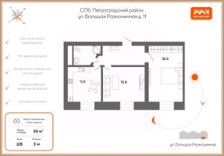 Двухкомнатная квартира состоит из двух комнат площадью 15,6 и 18,9 м. кв. кухней площадью 11,9 метров и совмещенным санузлом.