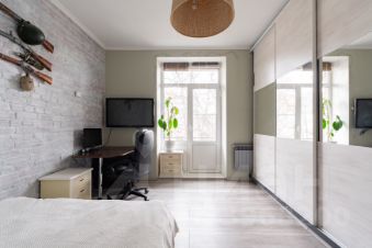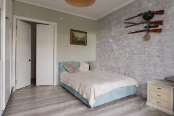 В "детской" оригинальный рисунок замка ручной работы, светлые стены и нейтральные обои - подойдет всем. Во второй комнате новая гардеробная система с большой вместимостью, сделанная под заказ.