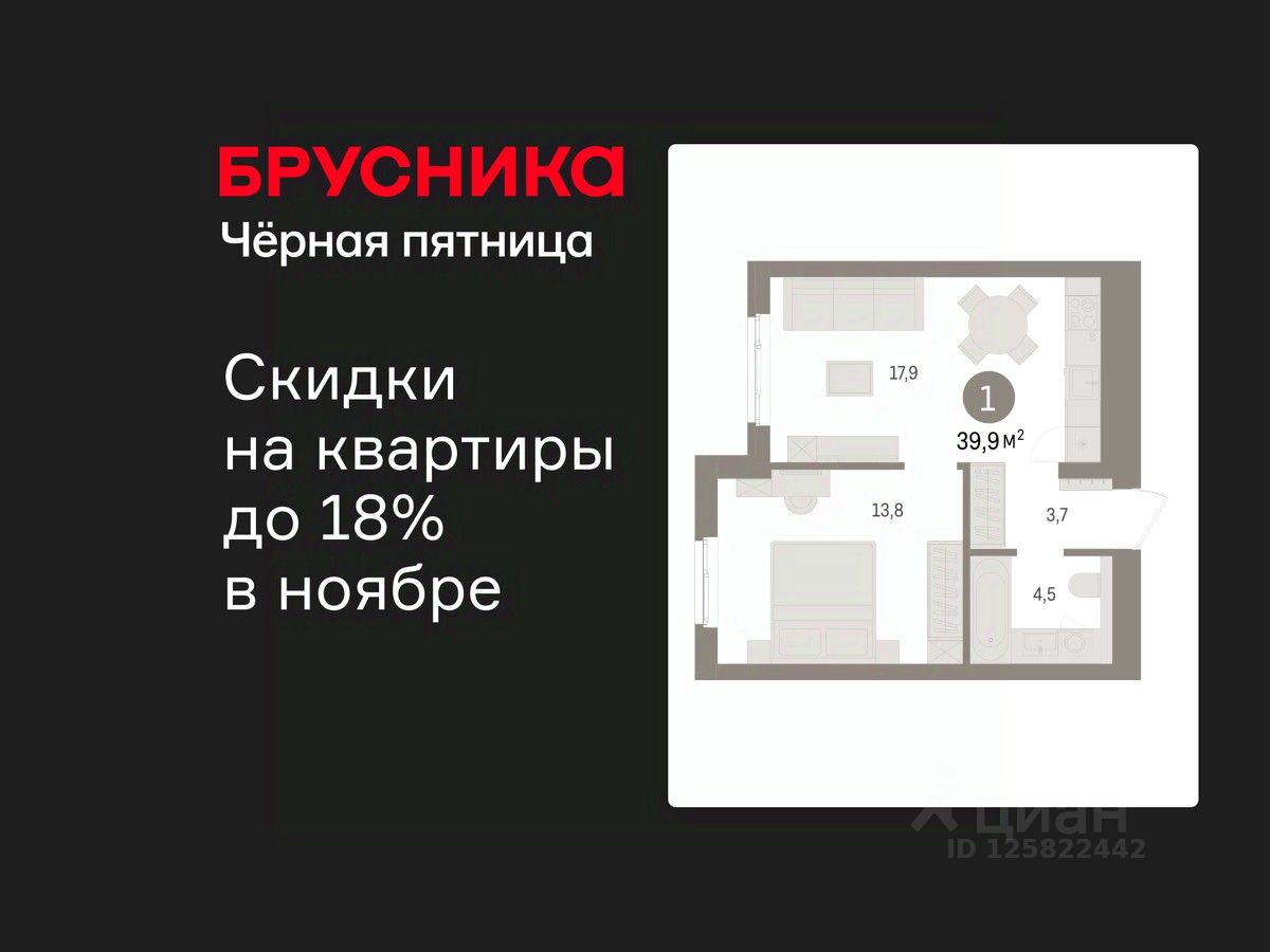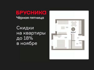 Продается 1-комн. квартира с предчистовой отделкой в ЖК "Брусника в Новоселье" на 3 этаже. Общая площадь: 39.85 кв.м., жилая: 13.8 кв.м., площадь просторной кухни-столовой: 17.9 кв.м. Все окна выходят на одну сторону. В квартире один совмещенный санузел. Высота потолков 2.7 м.