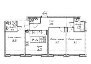 Кухня-гостиная 14, 27, мастер-спальня 14,96 с санузлом 3, 16, две отдельные комнаты 13,11 и 12,11, при входе прихожая 11,65 с двумя санузлами 3,28 и 1,64, высота потолков 2,7 м. 1 участник ДДУ.