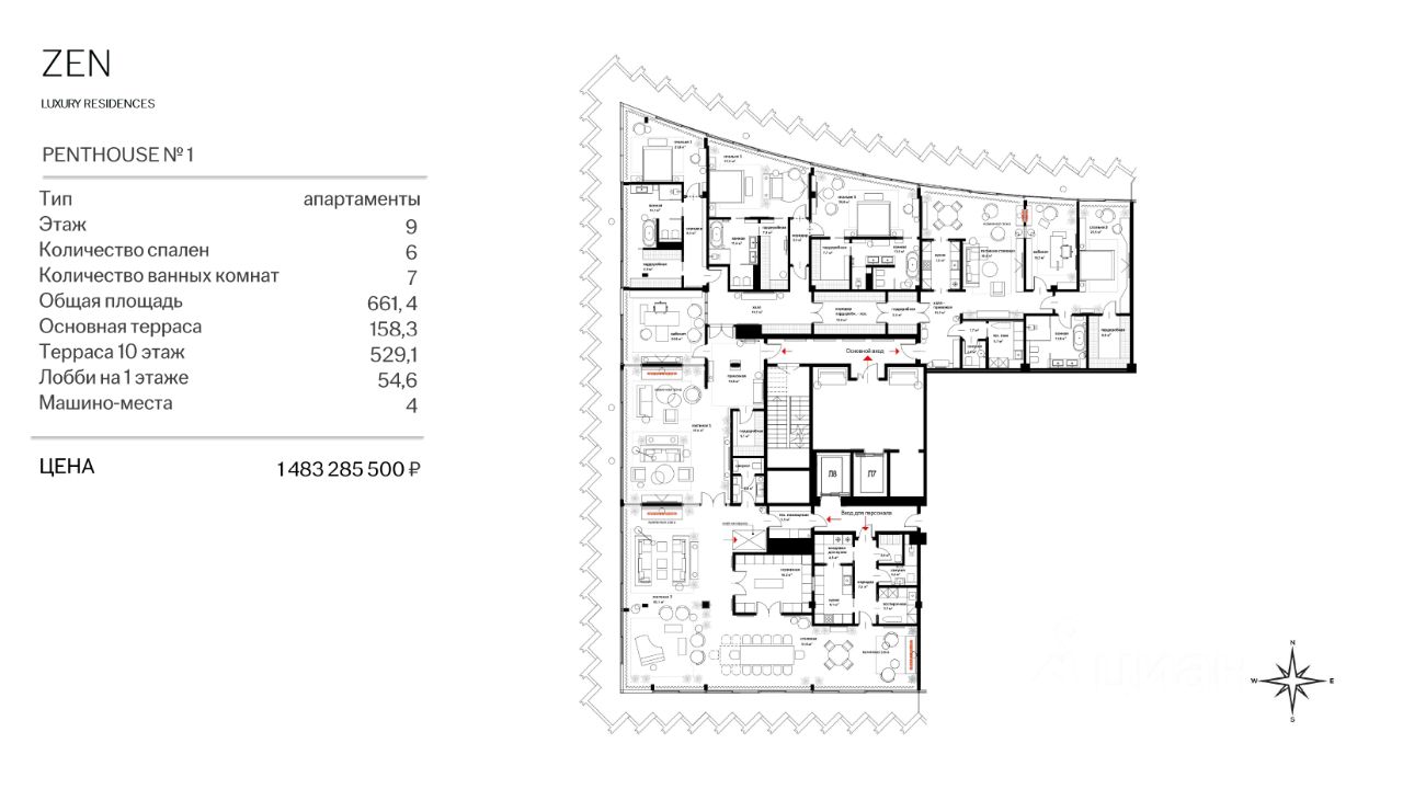 Этот пентхаус предлагает абсолютно приватный доступ: свой собственных вход в комплекс и лобби на первом этаже, личный лифт для владельца пентхауса и персонала доставит Вас на 9-ый этаж минуя общие зоны, Отдельный лифт на кровлю 10 этажа с панорамным видом на город. Наземный паркинг на 4 двухуровневых машино-места для Вашего автомобильного парка.