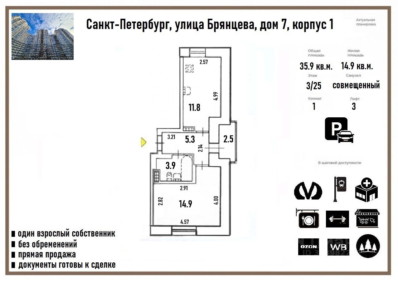 В ПРЯМОЙ продаже ПРОСТОРНАЯ однокомнатная квартира с хорошим ремонтом, расположенная в одном из самых благоприятных для жизни районов Петербурга!