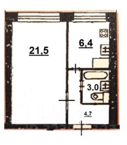 Общая площадь 35.6 кв.в., комната 21.5 кв.м., кухня 6,4 кв.м.. прихожая 4.7 кв.м., сан/узел совмещенный 3,0 кв.м., высота потолков 2.55 метра.
