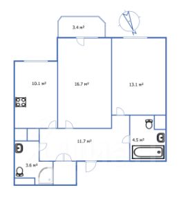 У квартиры функциональная планировка - кухня 10.1 кв.м, жилые комнаты площадью 16.7 и 13.1 кв.м. Окна выходят во двор. Два больших совмещенный санузла - один с ванной, второй с душем. При входе большая прихожая и есть гардеробная/кладовка.