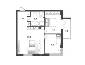Просторна кухня-гостиная 20.3 кв.м. Две спальни: 11.0 кв.м. с выходом на панорамный балкон 5.5 кв.м. и 8.9 кв.м. Ванная комната 6.4 кв.м. с ванной и тропическим душем. Прихожая 4.5 кв.м. с встроенными шкафами.