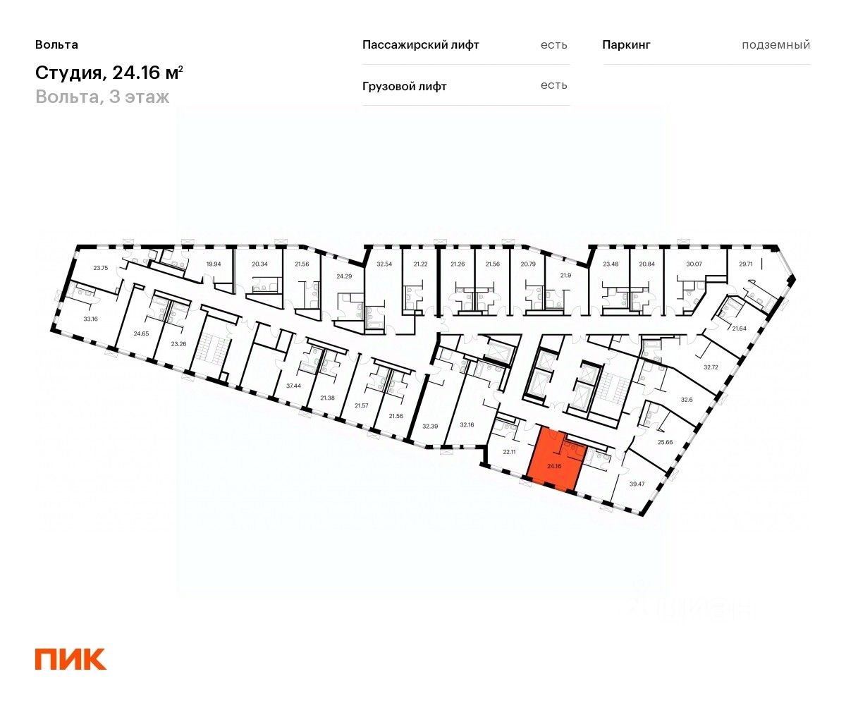 Продаются апартаменты-студия площадью 24,16 кв.м на 3 этаже 15 этажного дома (Вольта, Секция 1) проекта ПИК Вольта.
