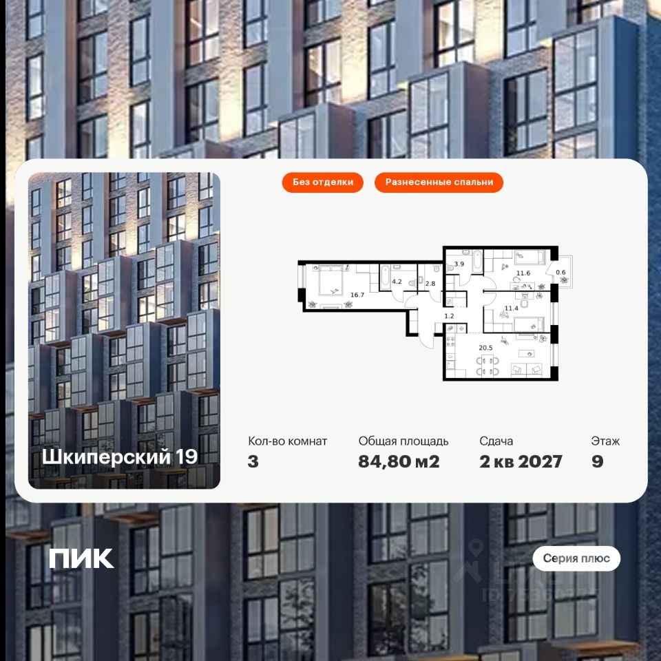 Продаётся 3-комн. квартира площадью 84,8 кв.м на 9 этаже 12 этажного дома (Корпус 2, Секция 5) проекта ПИК Шкиперский 19. Светлый просторный подъезд на уровне земли, функциональная планировка, большие окна, без отделки.