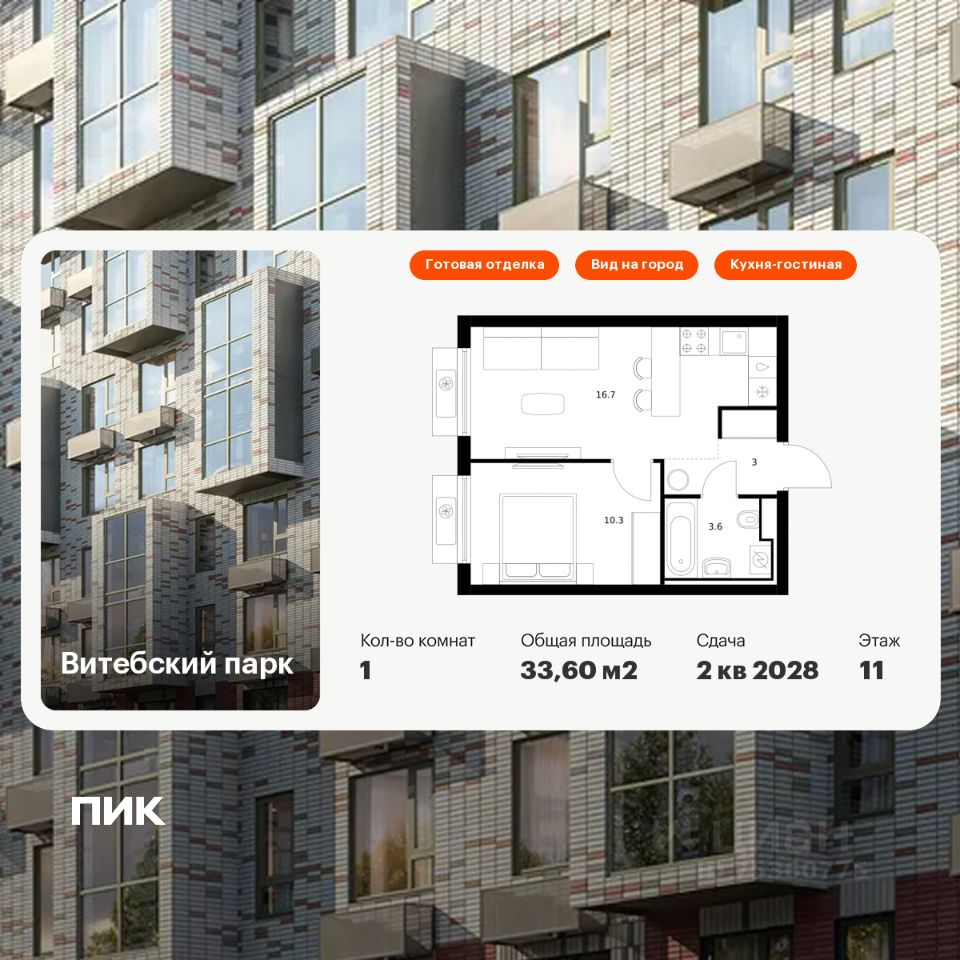 Продаётся 1-комн. квартира площадью 33,6 кв.м на 11 этаже 12 этажного дома (Корпус 7, Секция 2) проекта ПИК Витебский парк. Светлый просторный подъезд на уровне земли, функциональная планировка, большие окна, c отделкой.
