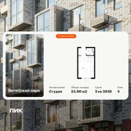 Продаётся квартира-студия площадью 23,9 кв.м на 4 этаже 12 этажного дома (Корпус 7, Секция 4) проекта ПИК Витебский парк. Светлый просторный подъезд на уровне земли, функциональная планировка, большие окна, c отделкой.