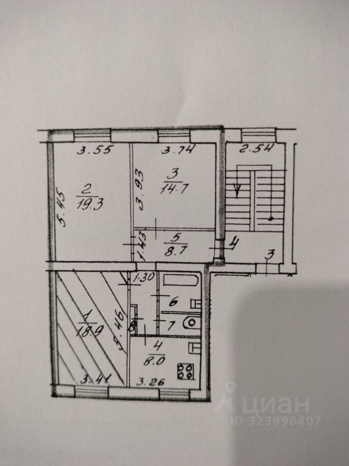 Квартира без ремонта, что дает отличную возможность воплотить все свои дизайнерские идеи и создать интерьер по своему вкусу. Жилая площадь составляет 53 кв. м, а кухня — 8 кв. м, комнаты 18,9+19, 3+14, 7 кв м