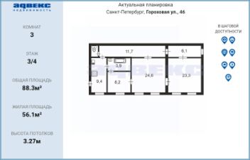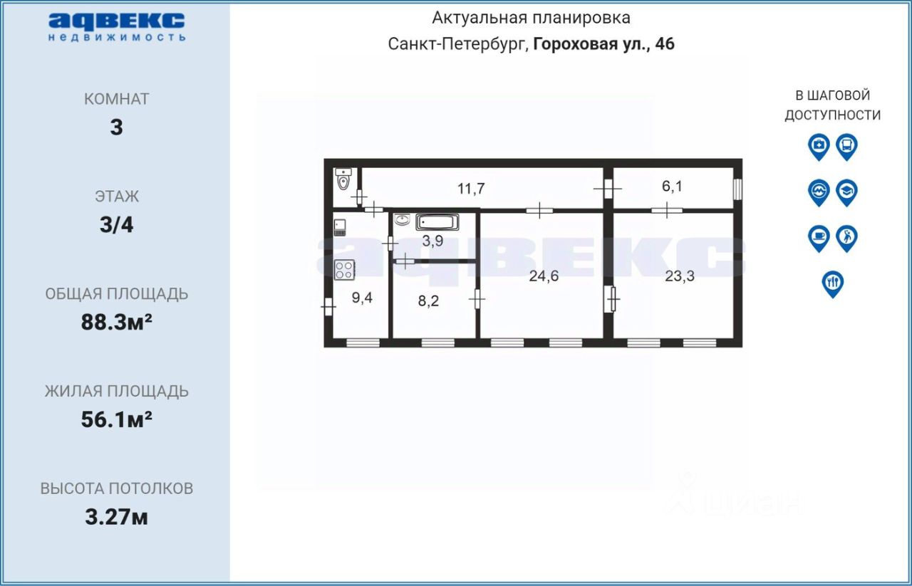 В самом центре Петербурга продается уникальная 3-х комнатная квартира с 7 окнами, позволяющая воплотить в жизнь самые смелые дизайнерские идеи с учетом приоритетов по стилю жизни и численности семьи. Квартира 88 кв. м. на Гороховой, 46 потолки 3,27 м2, большие комнаты , просторный коридор. Изначально грамотные классические пропорции жилых комнат в сочетании с хорошей высотой помещения формируют максимально комфортное пространство для местонахождения человека. Две комнаты из 3-х имеют по 2 окна, что дает огромное количество естественного света и, как следствие, возможность использования в интерьере насыщенных и даже темных цветов, и в совокупности с контрастными линиями оконных откосов и подоконников сделать дизайн интерьера уникальным. Все окна выходят на южную сторону, поэтому наше редкое Питерское солнце обязательно заглянет к Вам. А если захочется открыть окно, то все окна выходят в тихий двор, куда не долетает ни шум столичных улиц, ни копоть проезжающих автомобилей, двор закрытый.