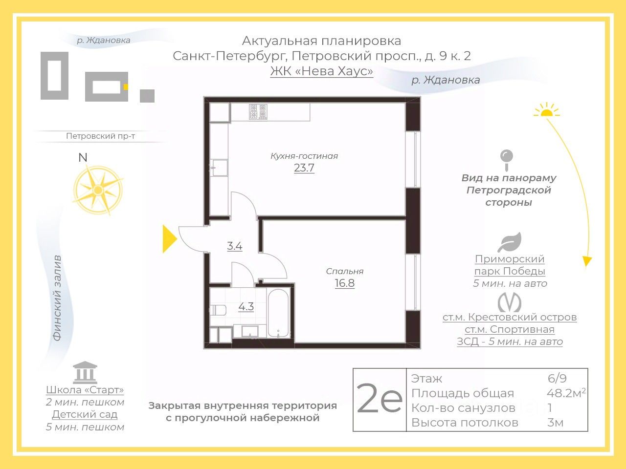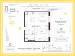 Петровская коса - это место, окруженное зеленью и водой. Всего в 5 минутах на автомобиле один из лучших парков города - Приморский парк Победы. Петроградская сторона, Центральный район, заезд на ЗСД, весь деловой и культурный центр - все это в 5-10 минутах от Вас.