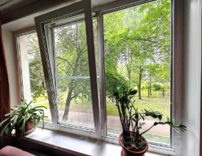 Квартира с изолированными комнатами на две стороны, окна соседних домов на достаточном расстоянии, чтобы комфортно чувствовать себя с открытыми шторами. Тень от деревьев защищает летом от избыточного солнца.
