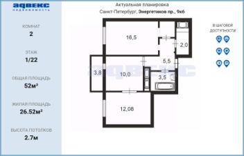 Жилая площадь - 26,52 кв.м ( 16.5+10,02).