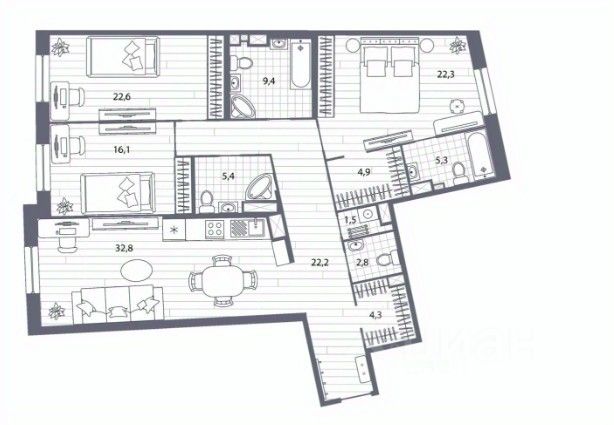 Квартира имеет двустороннюю планировку. Кухня-гостиная и две мастер спальни выходит окнами на набережную реки Карповки. Планировка позволяет сделать 3 мастер-спальни, так ка предусмотрено 4 сан. узла. Так же есть гардеробная комната и хозяйственная кладовая.
