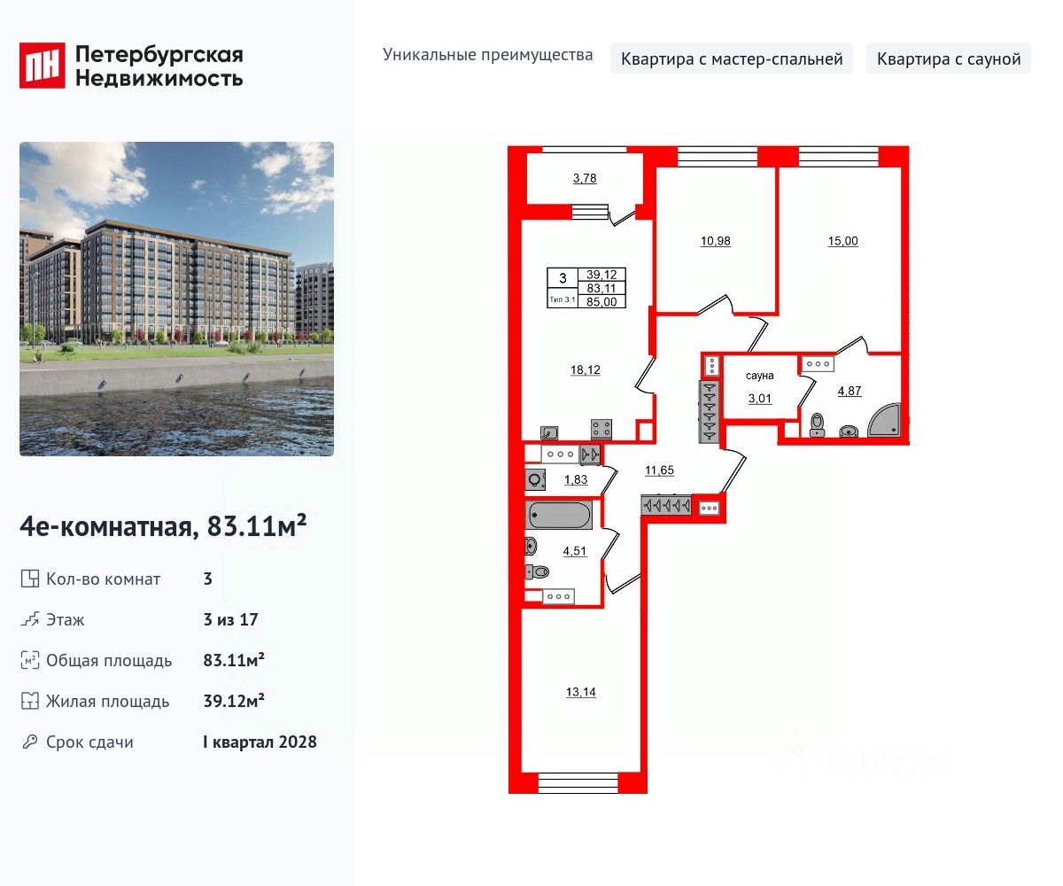 Уникальная, функциональная европланировка, большая кухня-гостиная 18.12 м², просторная прихожая 11.65 м². Общая площадь квартиры - 83.11 м², жилая 39.12 м², высота потолка 2.77 м.