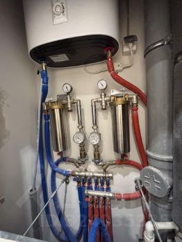 В санузле есть гигиенический душ, бойлер, профессиональная система фильтрации воды. Смеситель в просторной душевой кабине с термостатом и тропическим душем. Отдельная гардеробная с системой хранения.