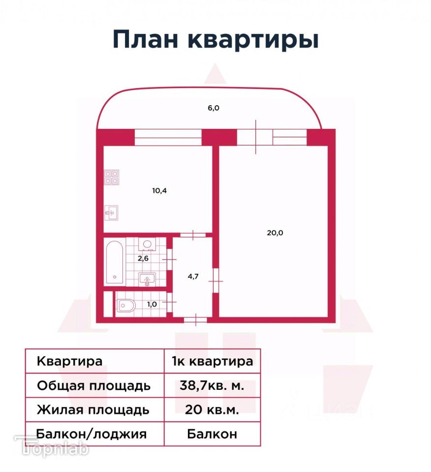 • Общая площадь: 38,7 м²