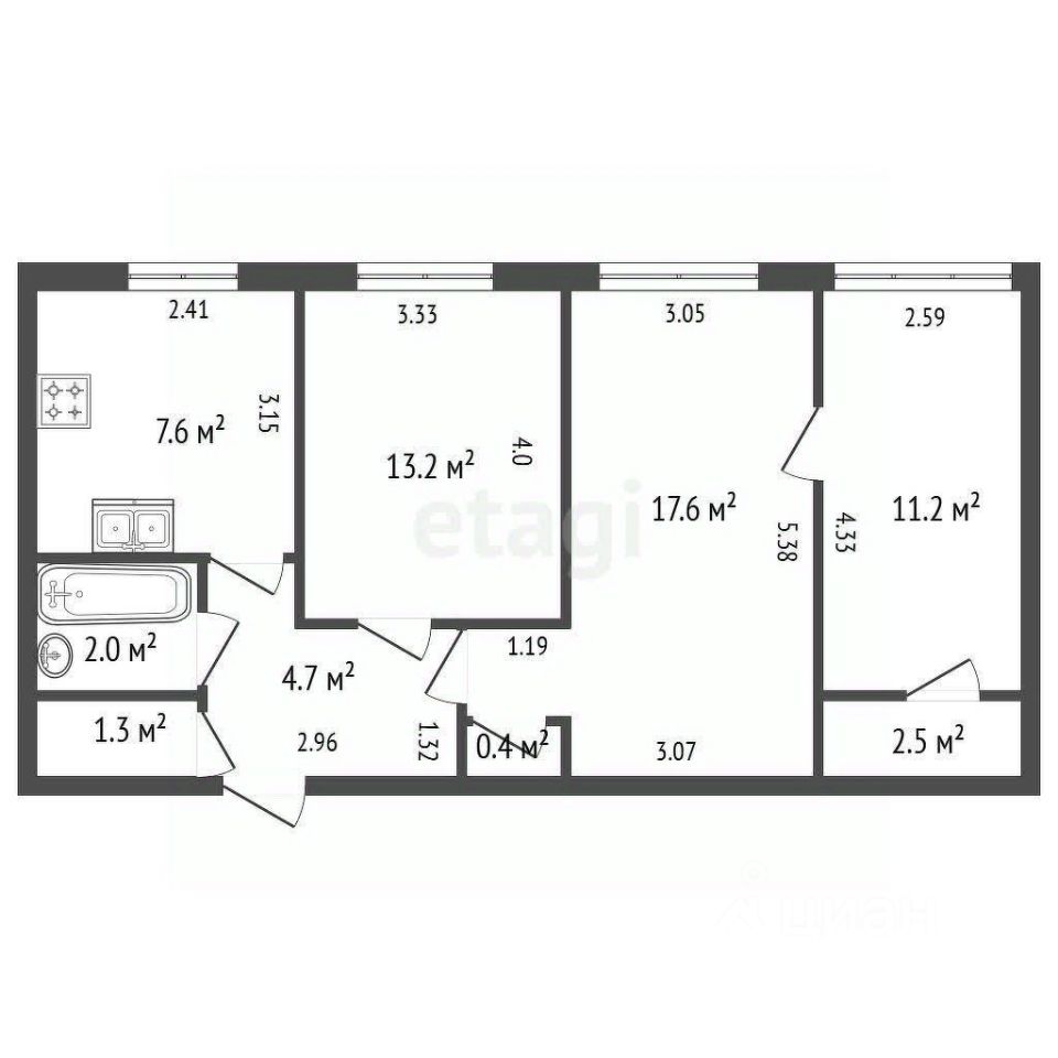 Общая площадь 60.5 кв.м, жилая площадь составляет 42 кв.м, кухня 7,6 кв.м.
