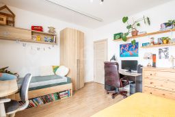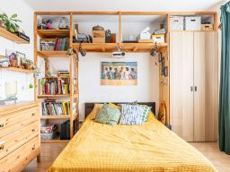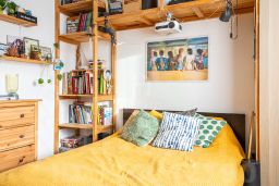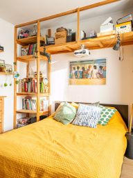 - В спальной комнате лаконично установлена система хранения, а также проектор для уютных киновечеров.