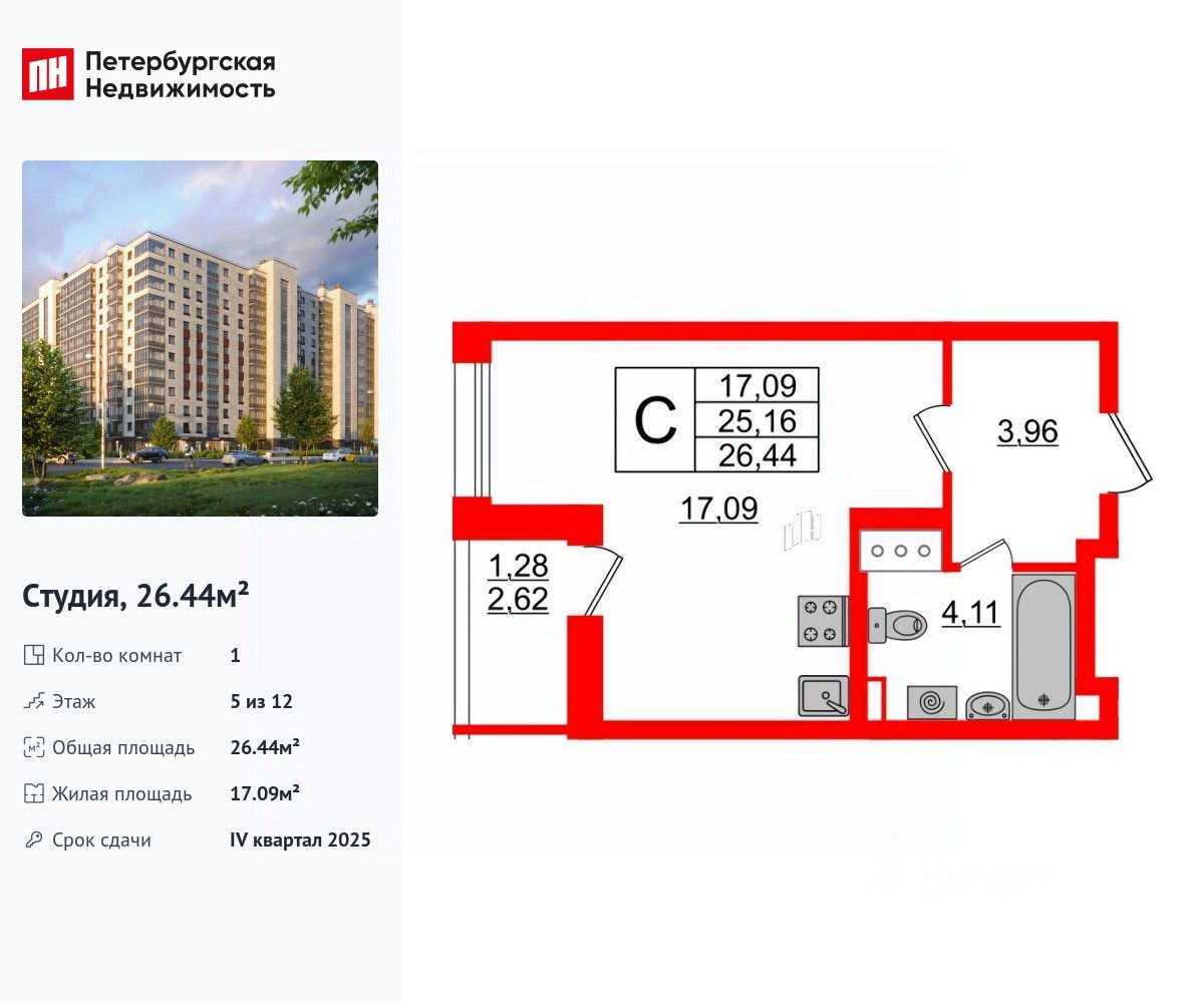 Удобная, классическая, функциональная европланировка, просторная прихожая 3.96 м². Общая площадь студии - 26.44 м², жилая 17.09 м², высота потолка 2.7 м.