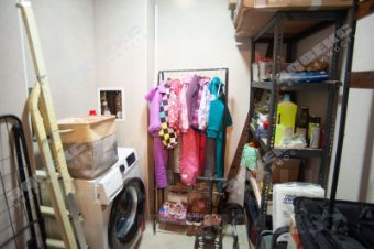 Помимо двух отдельных комнат и просторной кухни-гостиной планировкой предусмотрены 2 санузла, в одном из которых сейчас обустроена постирочная, и размещены стеллажи для хранения, а также есть гардеробная зона в спальне.