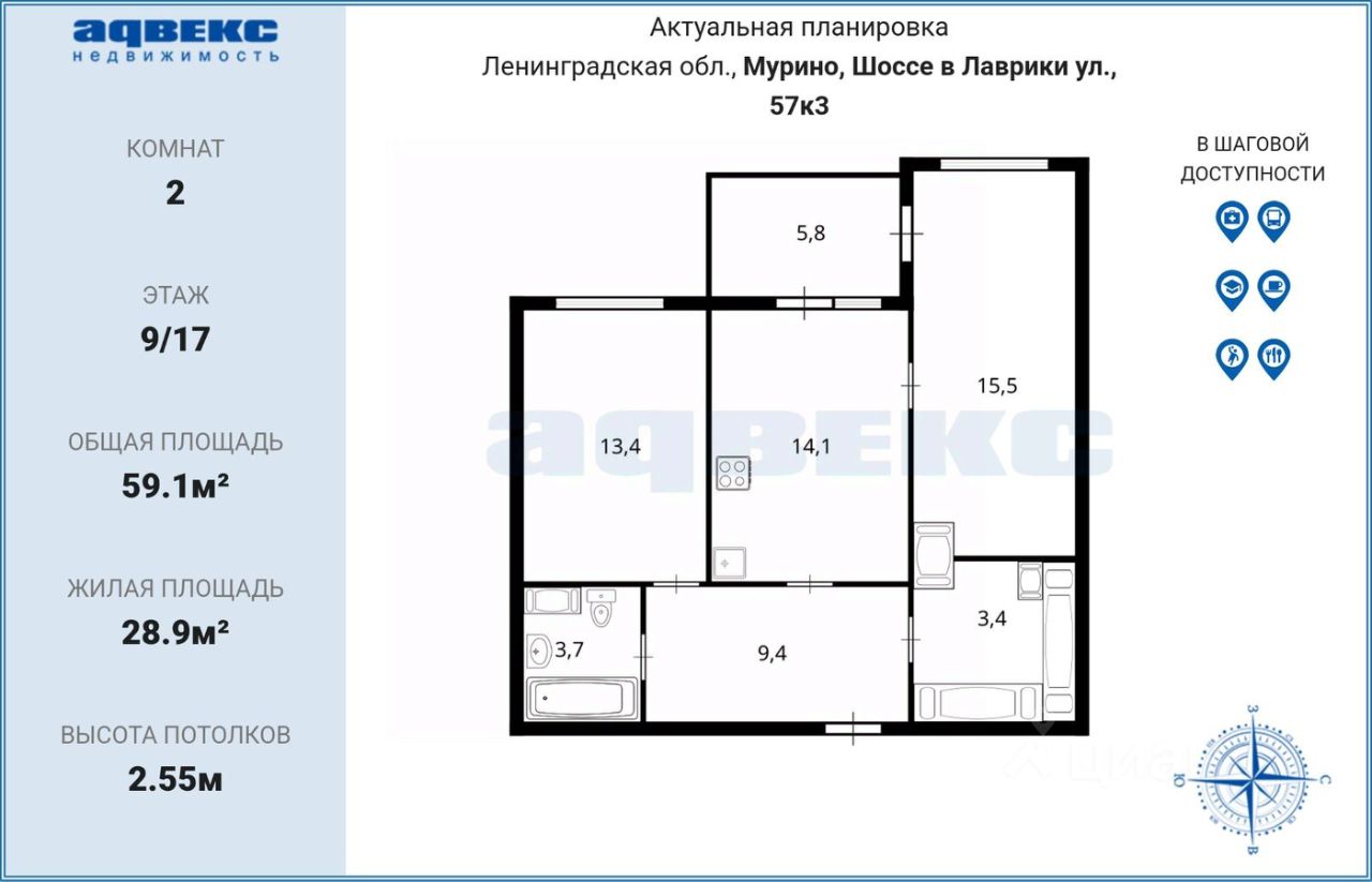 Предлагаем Вашему вниманию идеальную двухкомнатную квартиру с большим балконом в семейном жилом комплексе!