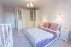 Спальня большая, здесь разместилась двуспальная кровать с ортопедическим матрасом, прикроватные тумбы и точечное освещение для каждой из сторон, а также установлен вместительный шкаф с распашными дверями.