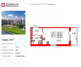 Уникальная, функциональная европланировка, вместительная прихожая 3.25 м². Общая площадь студии - 25 м², жилая 18.27 м², высота потолка 2.77 м.