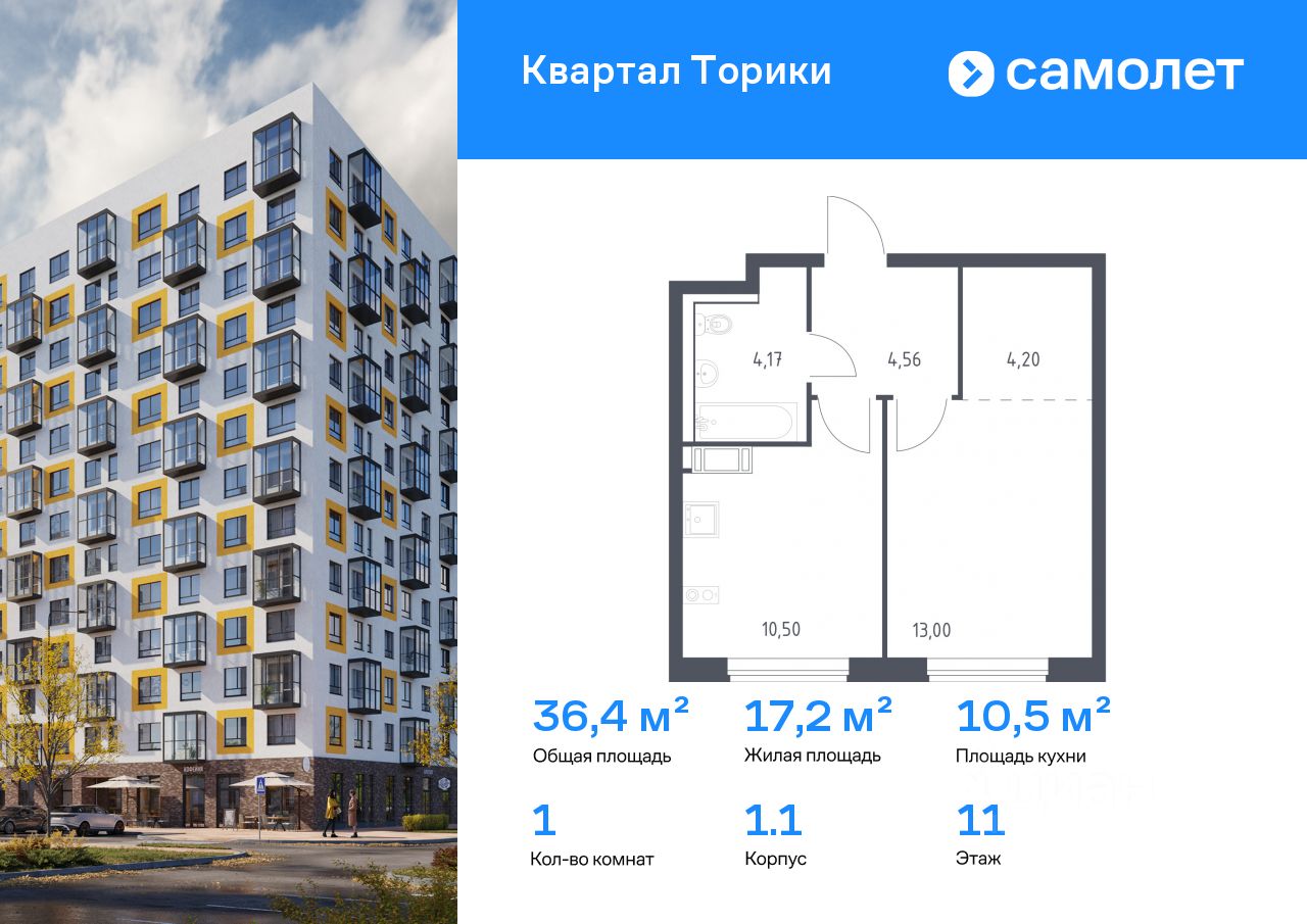 Строим кварталы для жизни с заботой о будущем. Предлагается 1-комнатная квартира комфорт-класса 36,43 кв.м в корпусе 1.1 на 11 этаже, в ЖК "Квартал Торики"