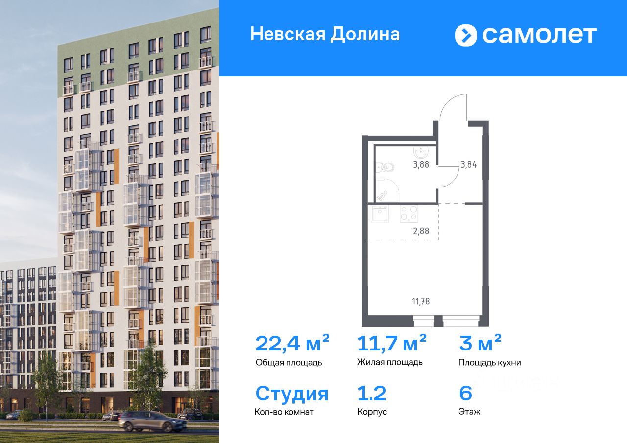 Строим кварталы для жизни с заботой о будущем. Предлагается квартира студия комфорт-класса 22,38 кв.м в корпусе 1.2 на 6 этаже, в ЖК "Невская Долина"