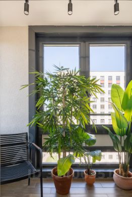 Застекленная лоджия располагает к отдыху или к организации рабочего пространства.