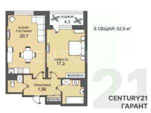 Большая кухня-гостиная площадью 20.7м2 разделена на две зоны