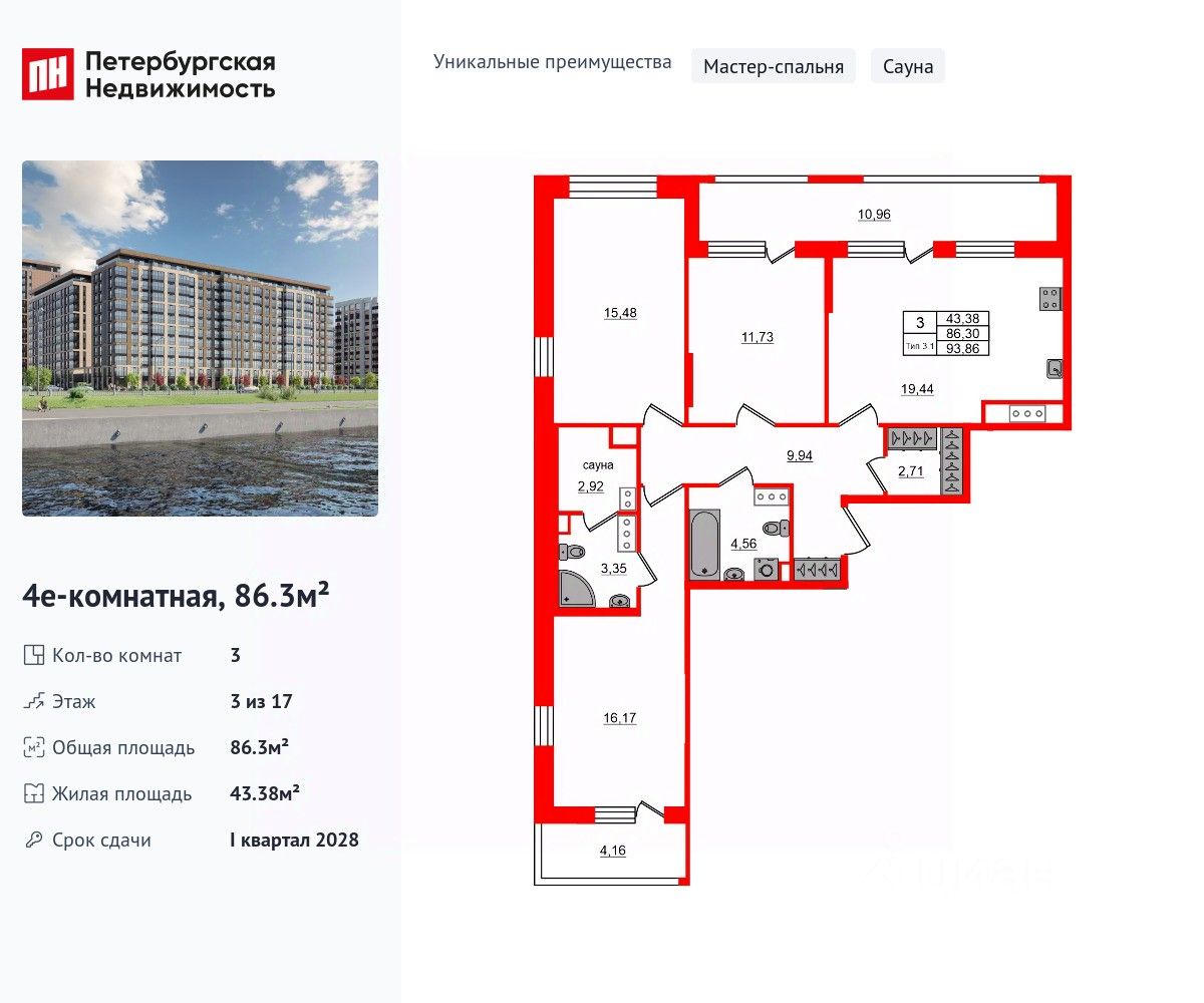 Уникальная, функциональная европланировка, большая кухня-гостиная 19.44 м², вместительная прихожая 9.94 м². Общая площадь квартиры - 86.3 м², жилая 43.38 м², высота потолка 2.77 м.