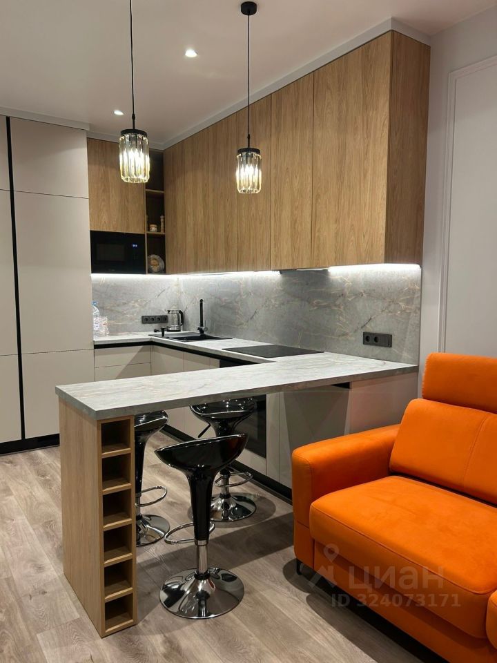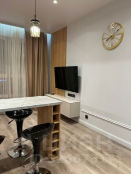Кухня-гостиная полностью оборудованная: диван, тумба, телевизор, современный кухонный гарнитур с встроенной бытовой техникой.