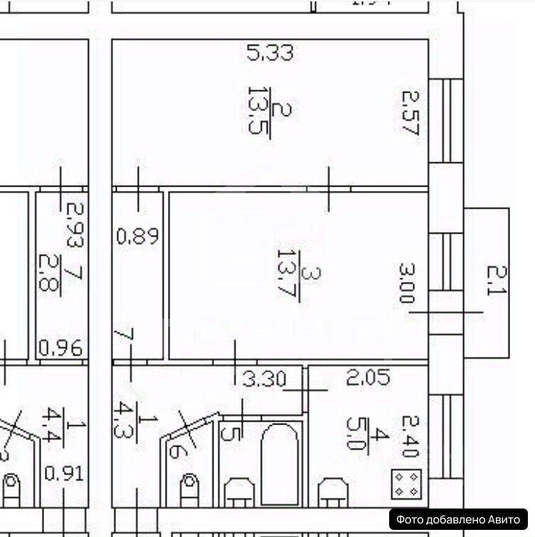 Общая площадь квартиры составляет 43 кв. м, из которых жилая площадь — 27,2 кв. м (комнаты 13,5 и 13,7 кв. м), а кухня — 5 кв. м. Две изолированные комнаты, балкон и раздельный санузел создают комфортные условия для проживания.
