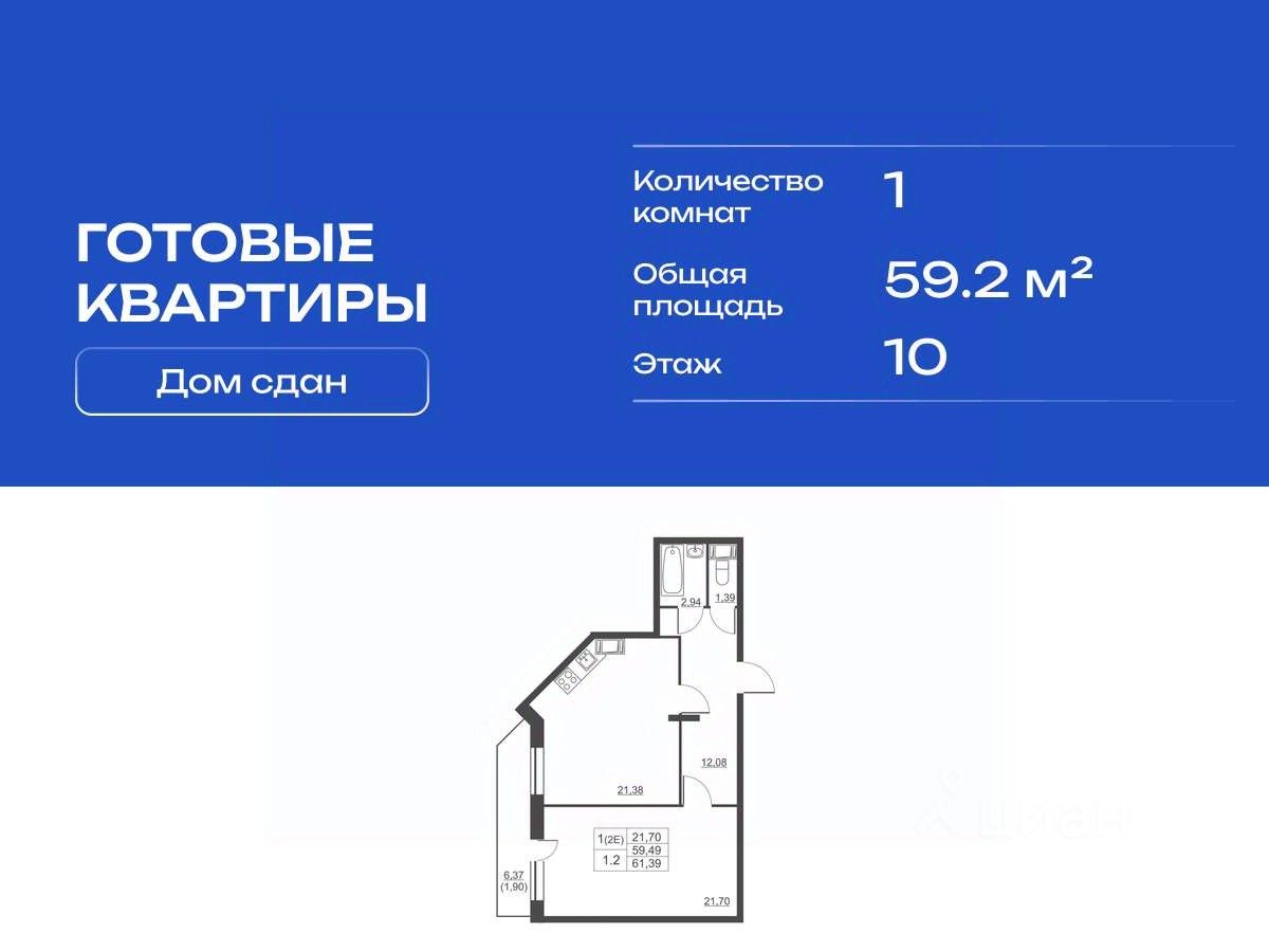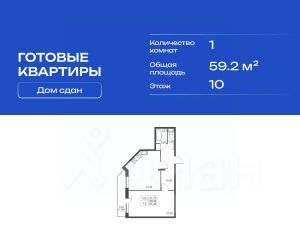 Продается однокомнатная квартира в сданном жилом комплексе на 10 этаже одинадцатиэтажного дома. Общая площадь 59.20 кв. м. чистовая отделка от застройщика