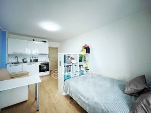 Студия располагается на 21-ом этаже 23-х этажного дома. У дома есть собственная котельная, приятный двор с детской площадкой. В доме два скоростных лифта: грузовой и пассажирский. Чистый, просторный подъезд. Дом в приятных тонах.