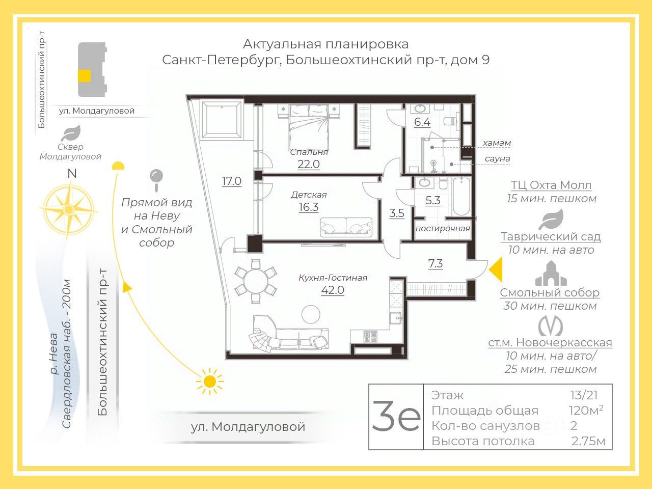 Квартира с планировкой "3-евро", 2 стильные спальни, либо из второй спальни можно устроить функциональный кабинет, просторная кухня-гостиная с потрясающим видом на Неву и Смольный.