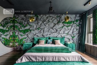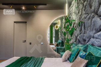Просторная спальня 21.5 м2, выполнена в дизайнерском стиле, установлен домашний кинотеатр.