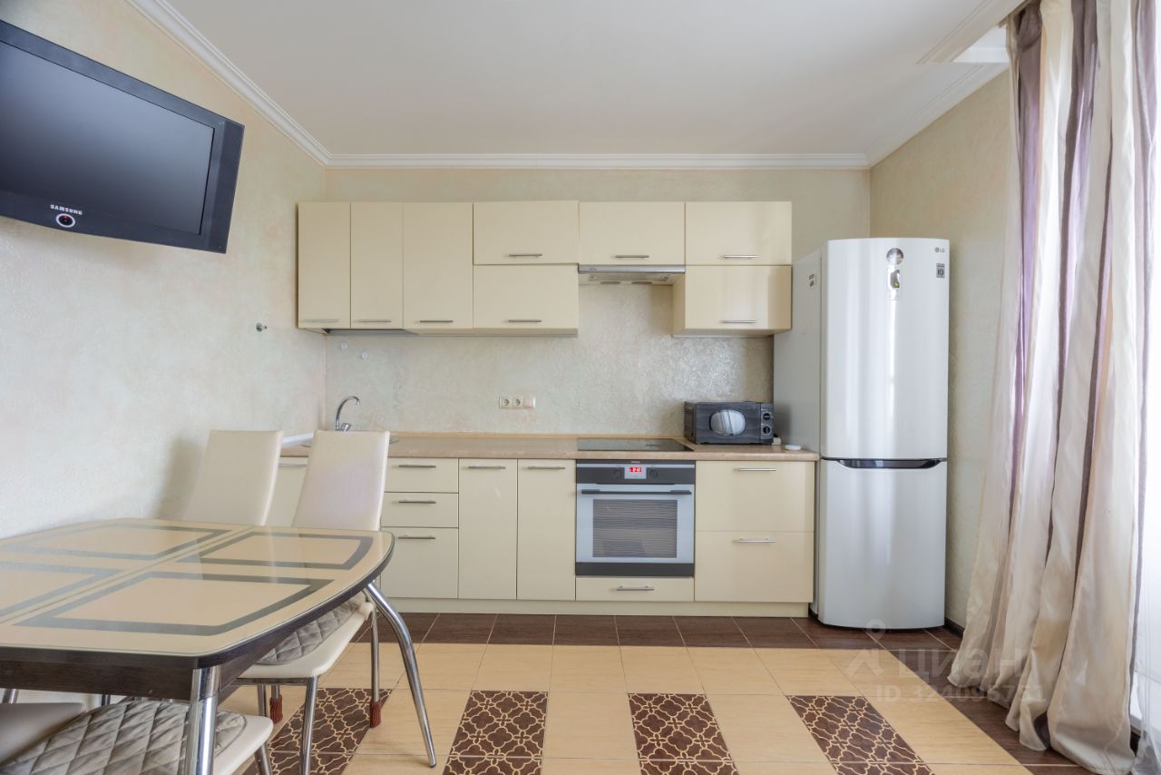 В квартире есть всё необходимое для комфортного проживания: прекрасная кухонная зона оборудована полноценным кухонным гарнитуром, выполненным в тёплых тонах, установлена необходимая для комфортной жизни бытовая техника (варочная панель, духовой шкаф, полноценная вытяжка, микроволновка, большой холодильник, чайник).