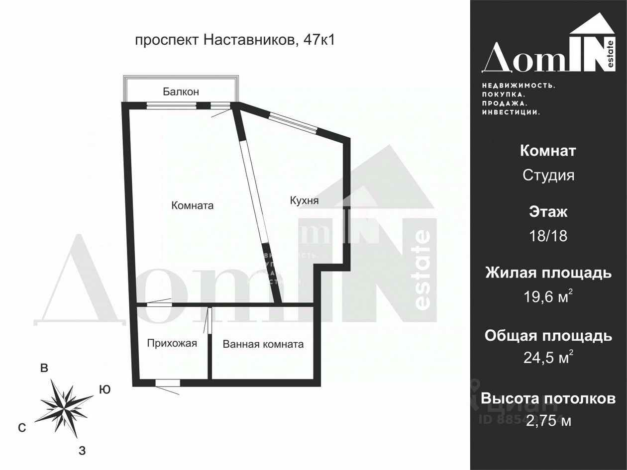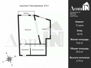 Супер планировка: Площадь 24,5 кв.м., комната 19.6 кв.м. с выделенной зоной кухни, просторный с/у, уютная прихожая, застеклённая лоджия, высота потолков 2,75 метра.