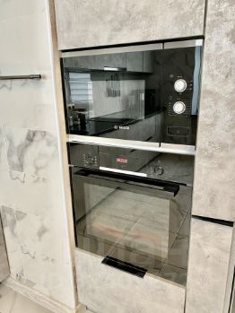 Большая кухня с импортной техникой, каменной столешницей и подоконником.