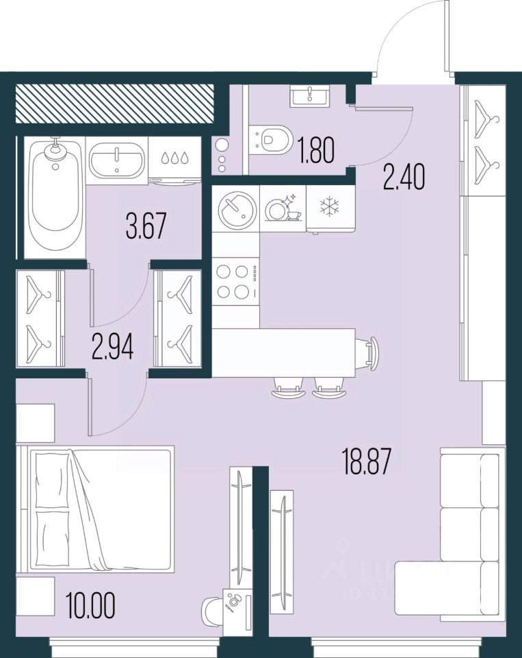 1-комн. квартира с предчистовой отделкой в ЖК "Новая Земля" на 12 этаже. Общая площадь: 38.77 кв.м., жилая: 10 кв.м., площадь просторной кухни-столовой: 18.87 кв.м. Все окна выходят на одну сторону. В квартире один раздельный санузел. Высота потолков 2.85 м.